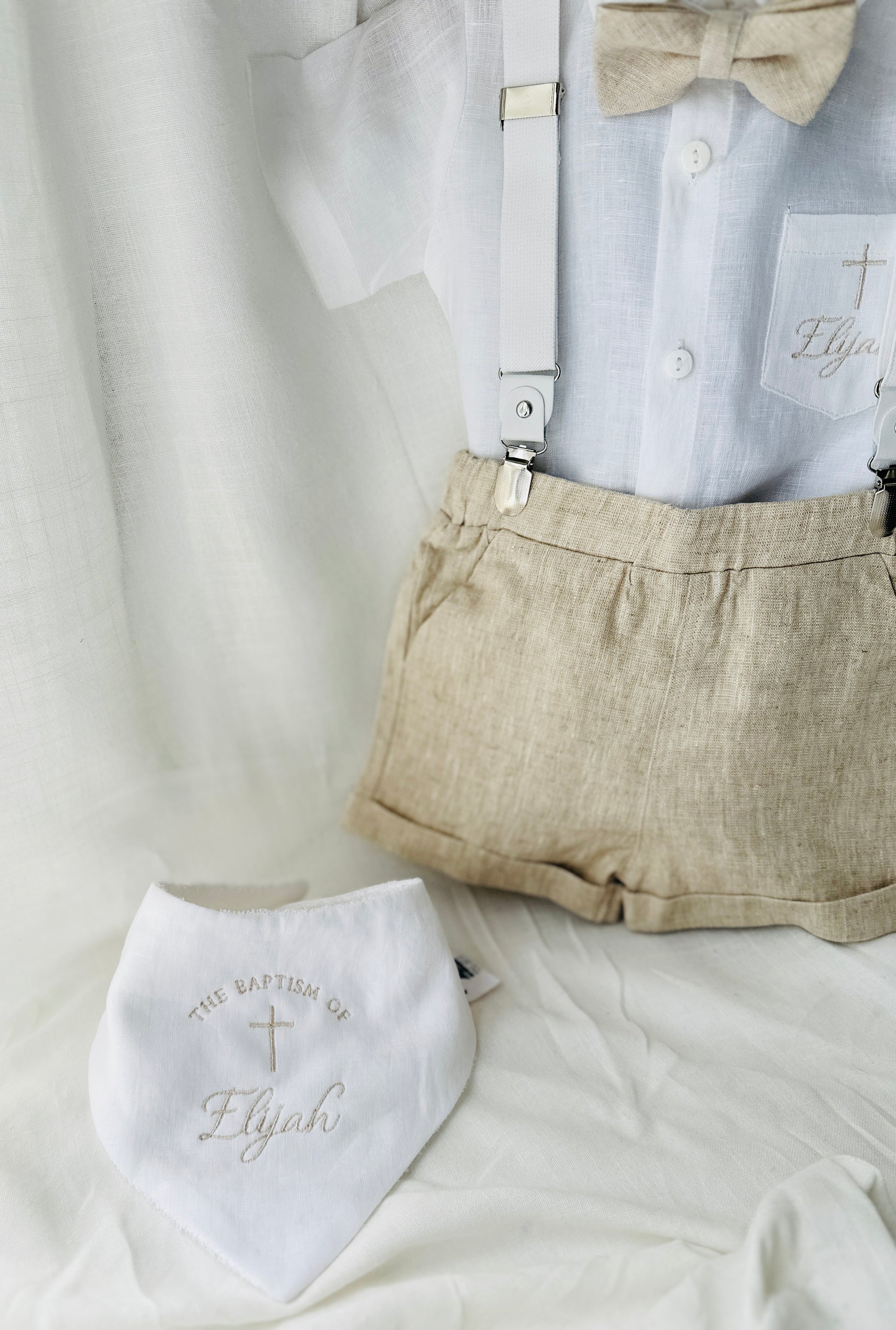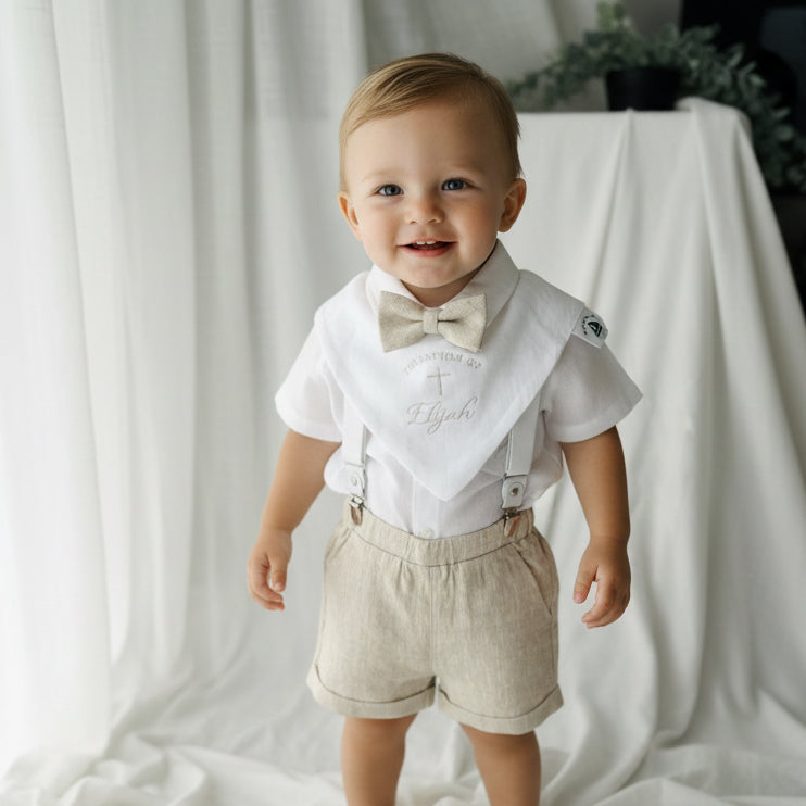 100% linen front and soft fleece reverse, snap closure, bandana style bib to match the linen suits and bow ties. Protect your outfit from dribble and spills during the special event!