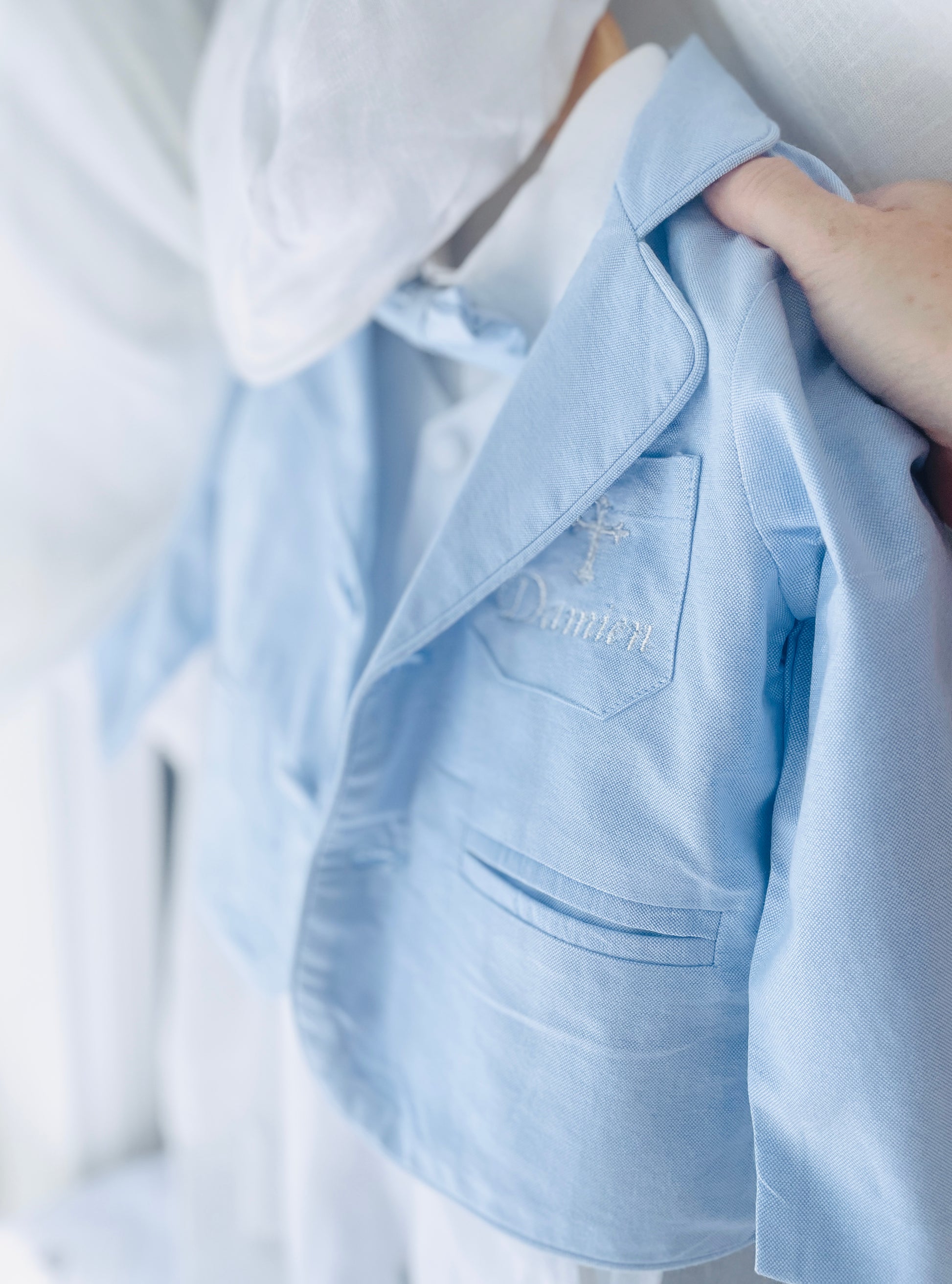 Add on embroidery (available on the shirt pocket, collar, or cuff and the jacket also). If ordering the full suit with jacket, we usually recommend the name on the shirt, and the initial(s) on the jacket. You can then add a cross on the shirt above the child's name, or on the shirt collar if you wish.