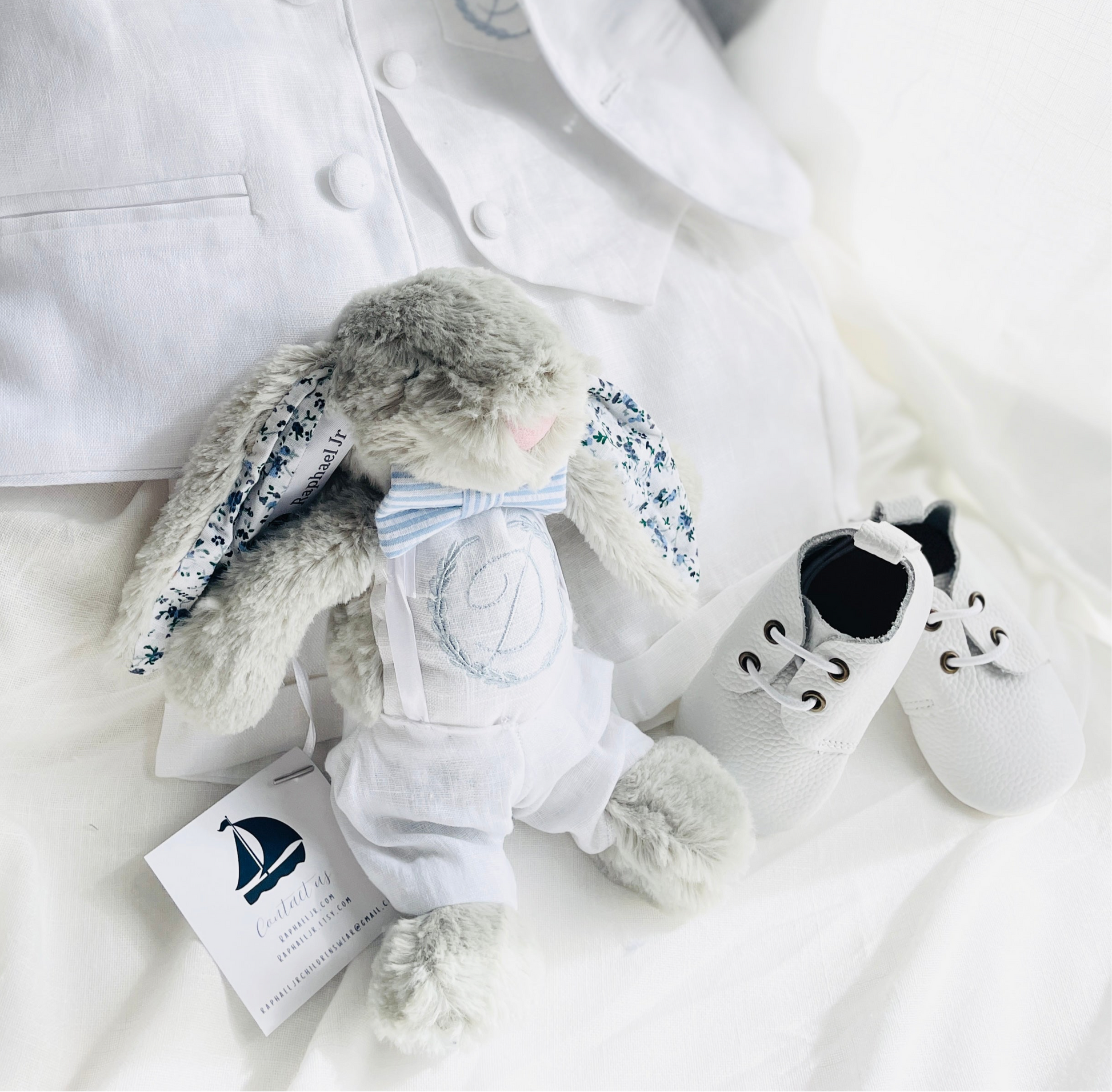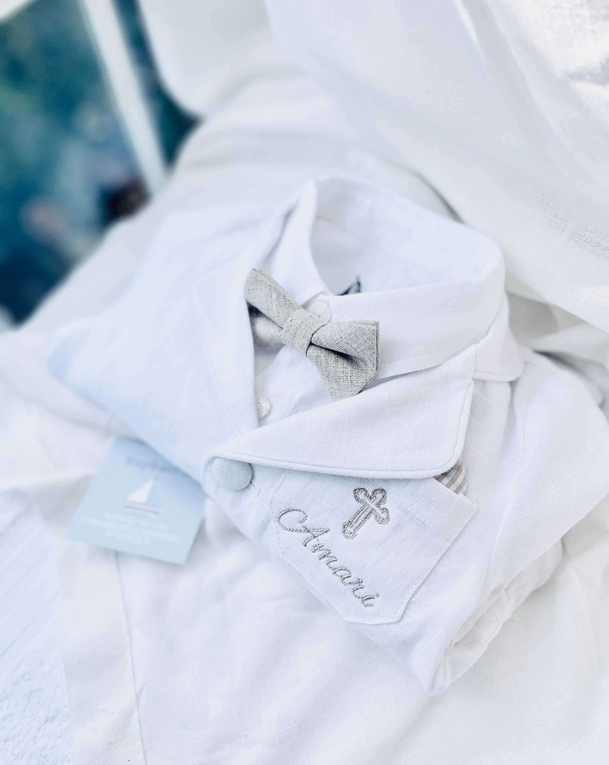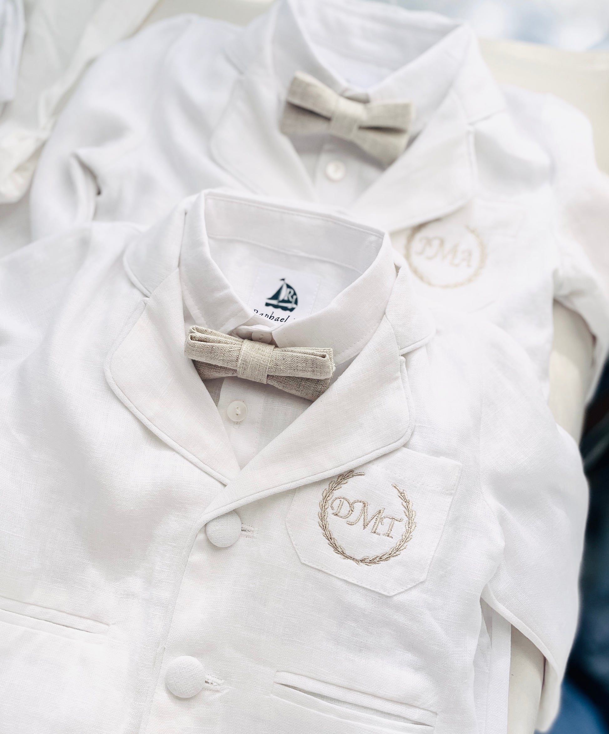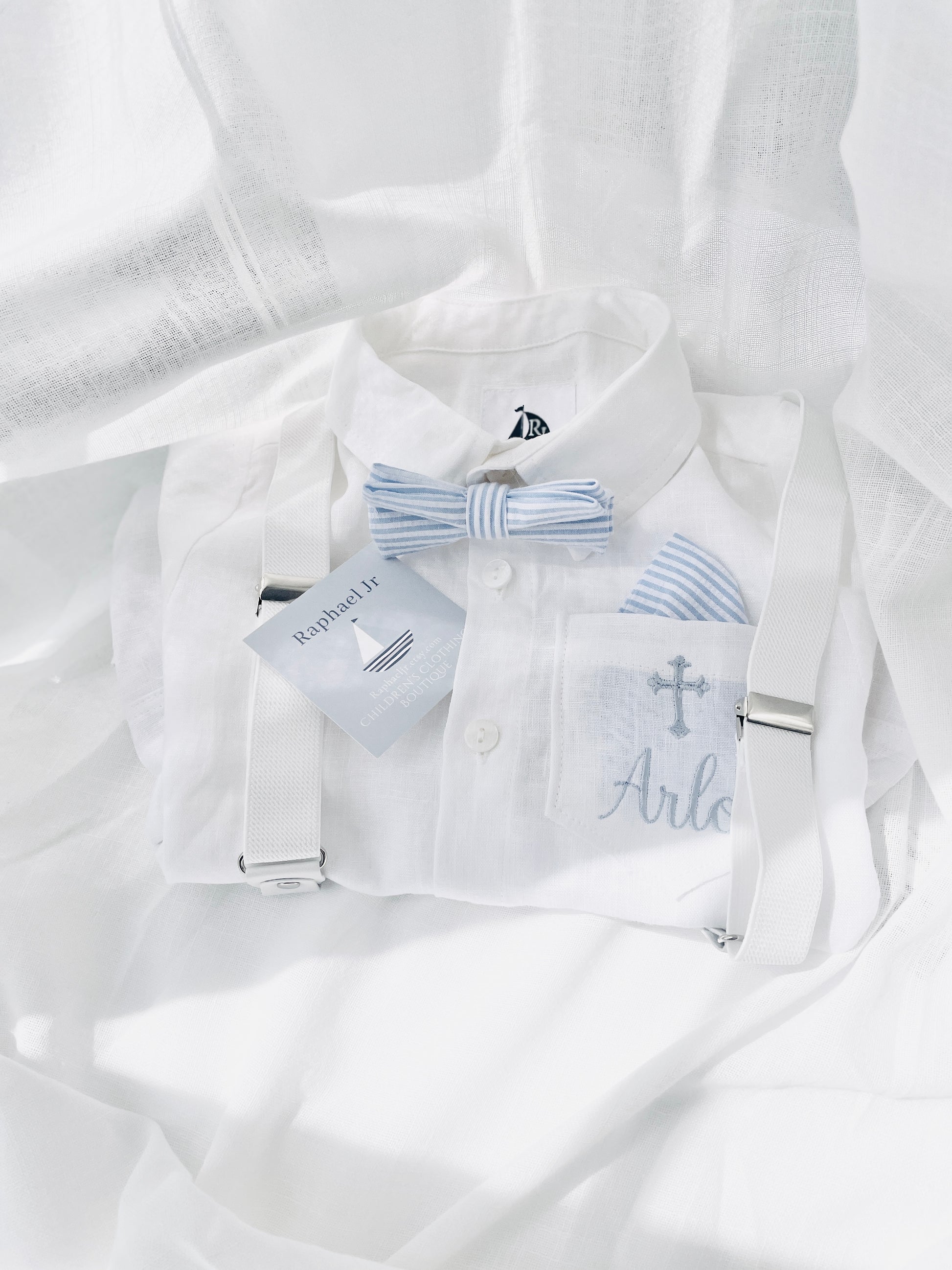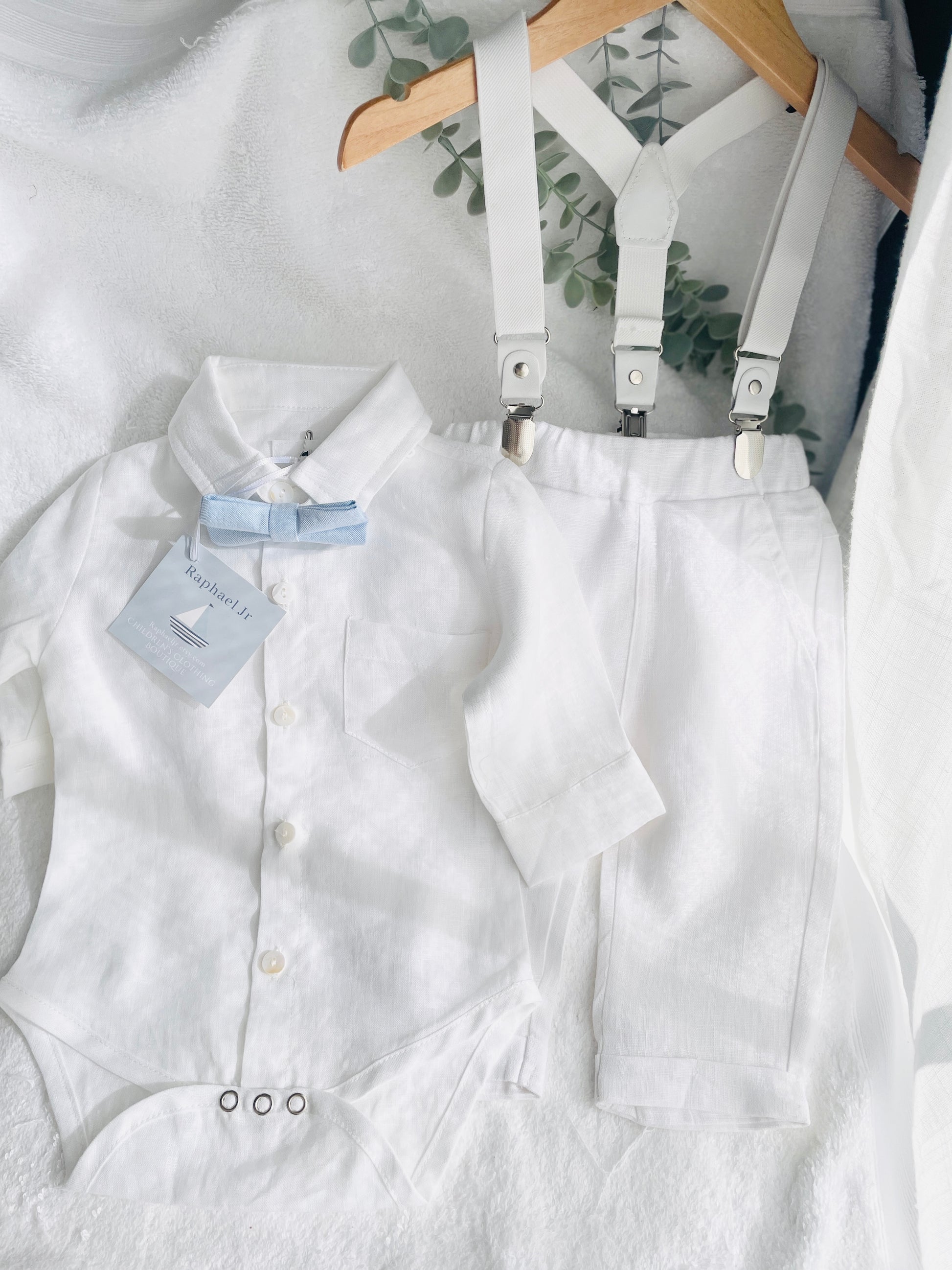 White linen Baptism suit set with pants, shirt, suspenders and bowtie plus optional extras
