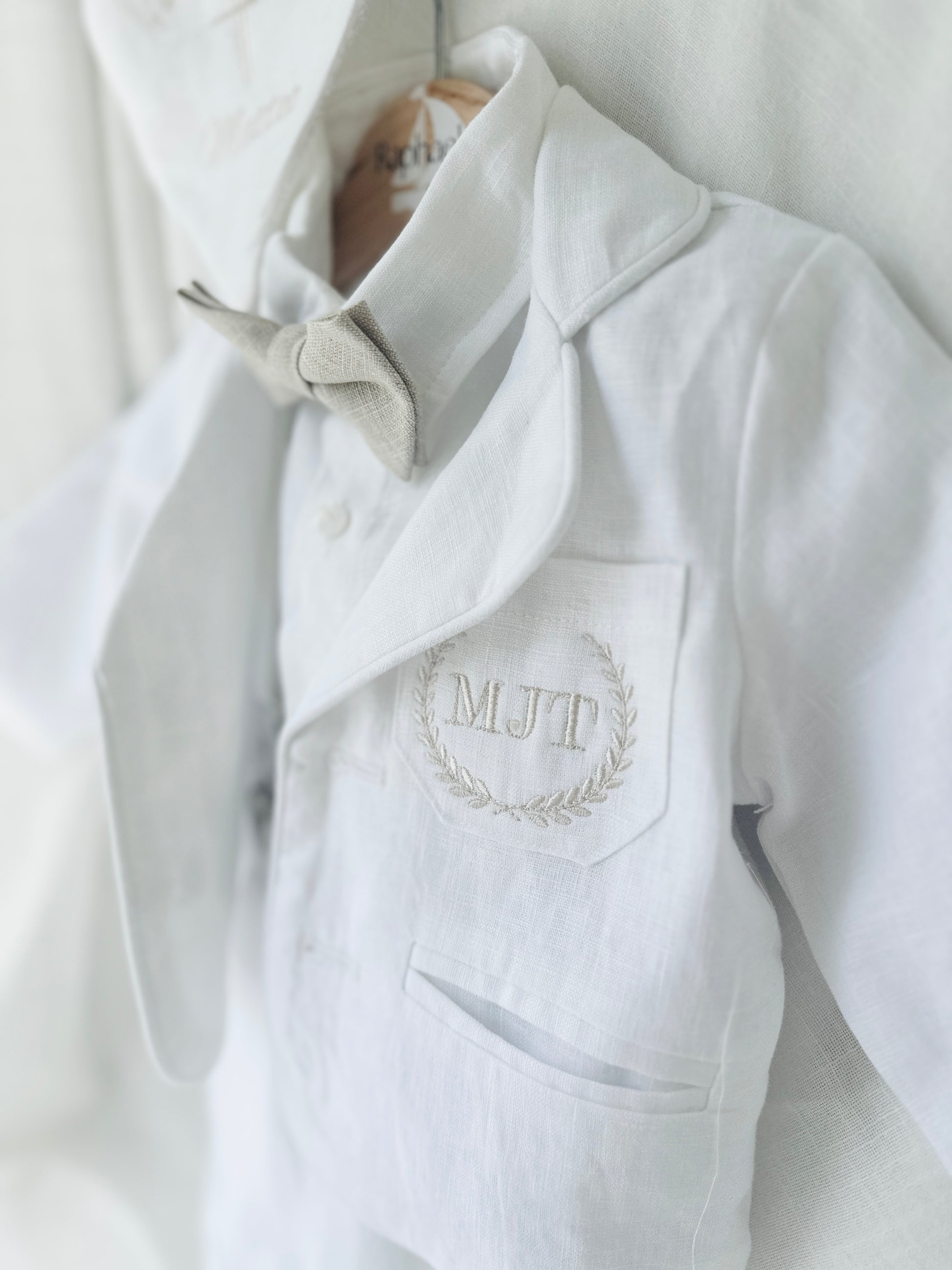 White linen Baptism suit set with pants, shirt, suspenders and bowtie plus optional jacket and extras