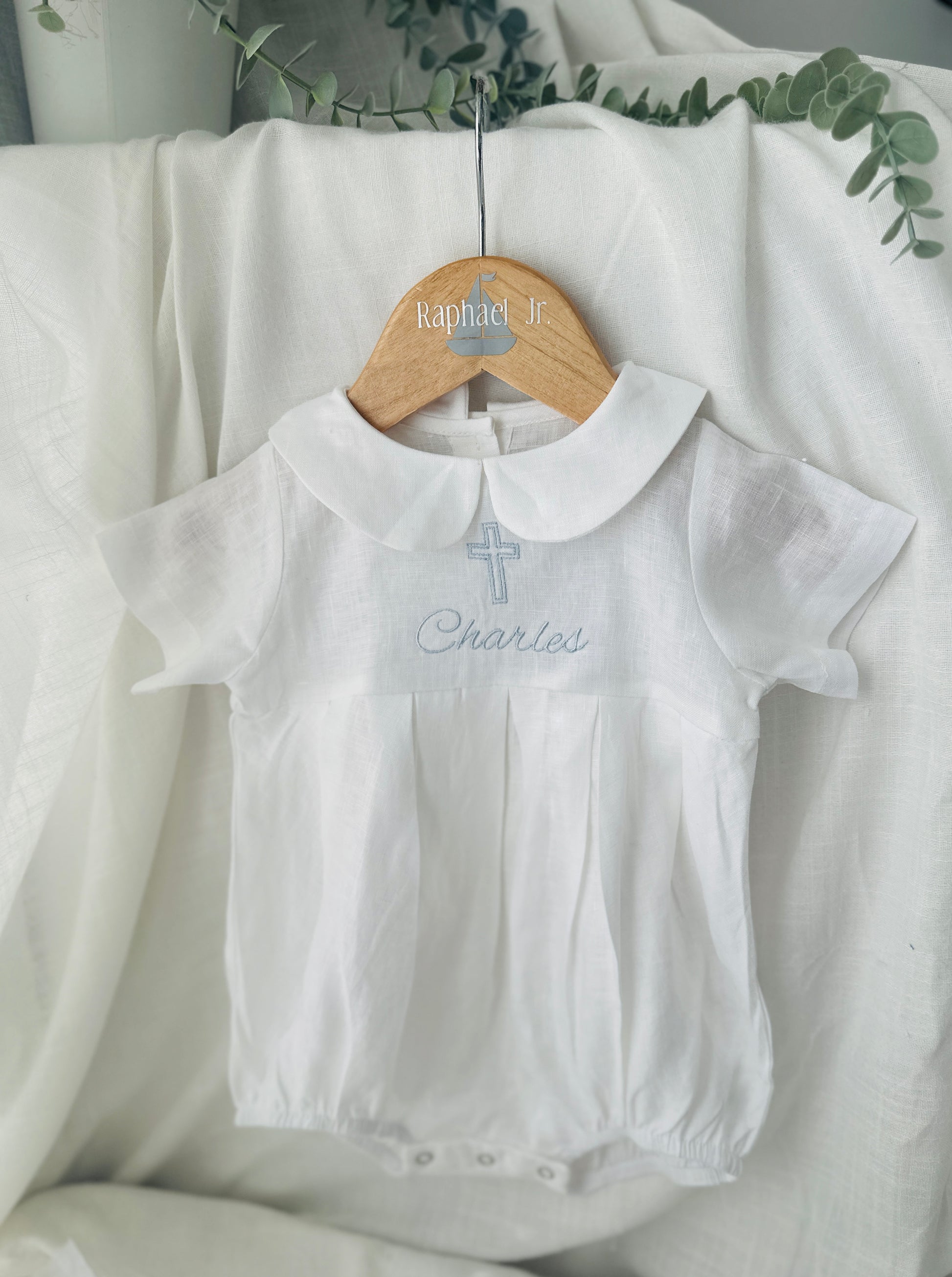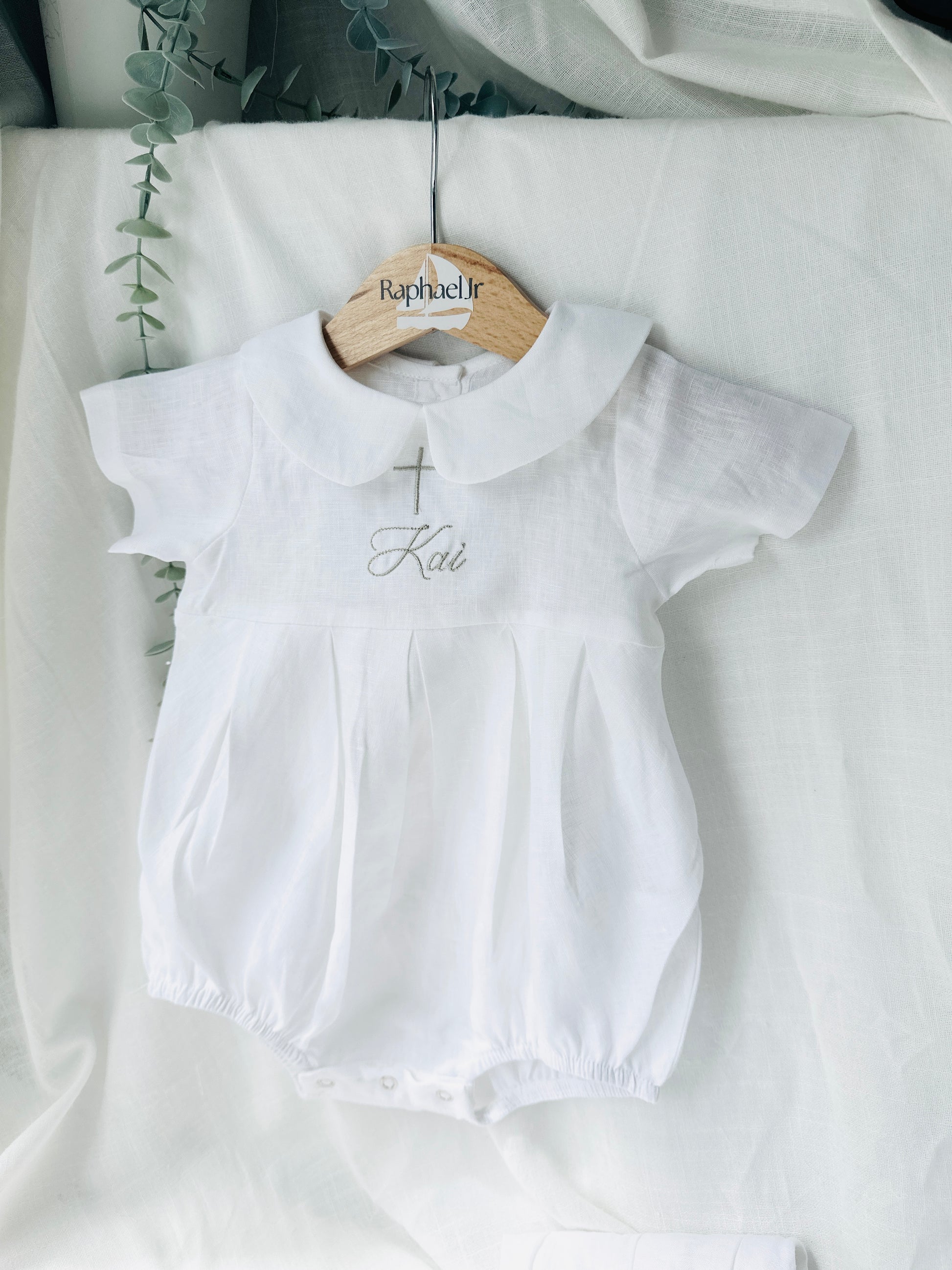 Linen Baptism peter pan collar romper outfit with optional embroidery customisation
