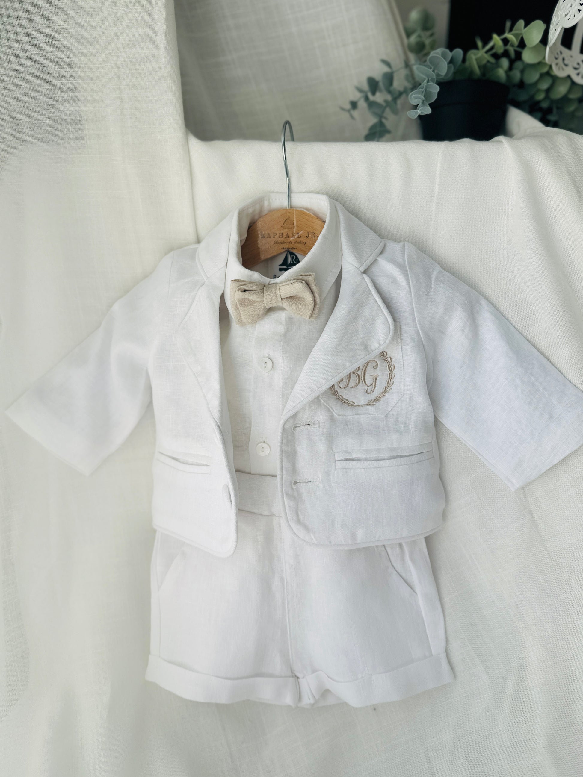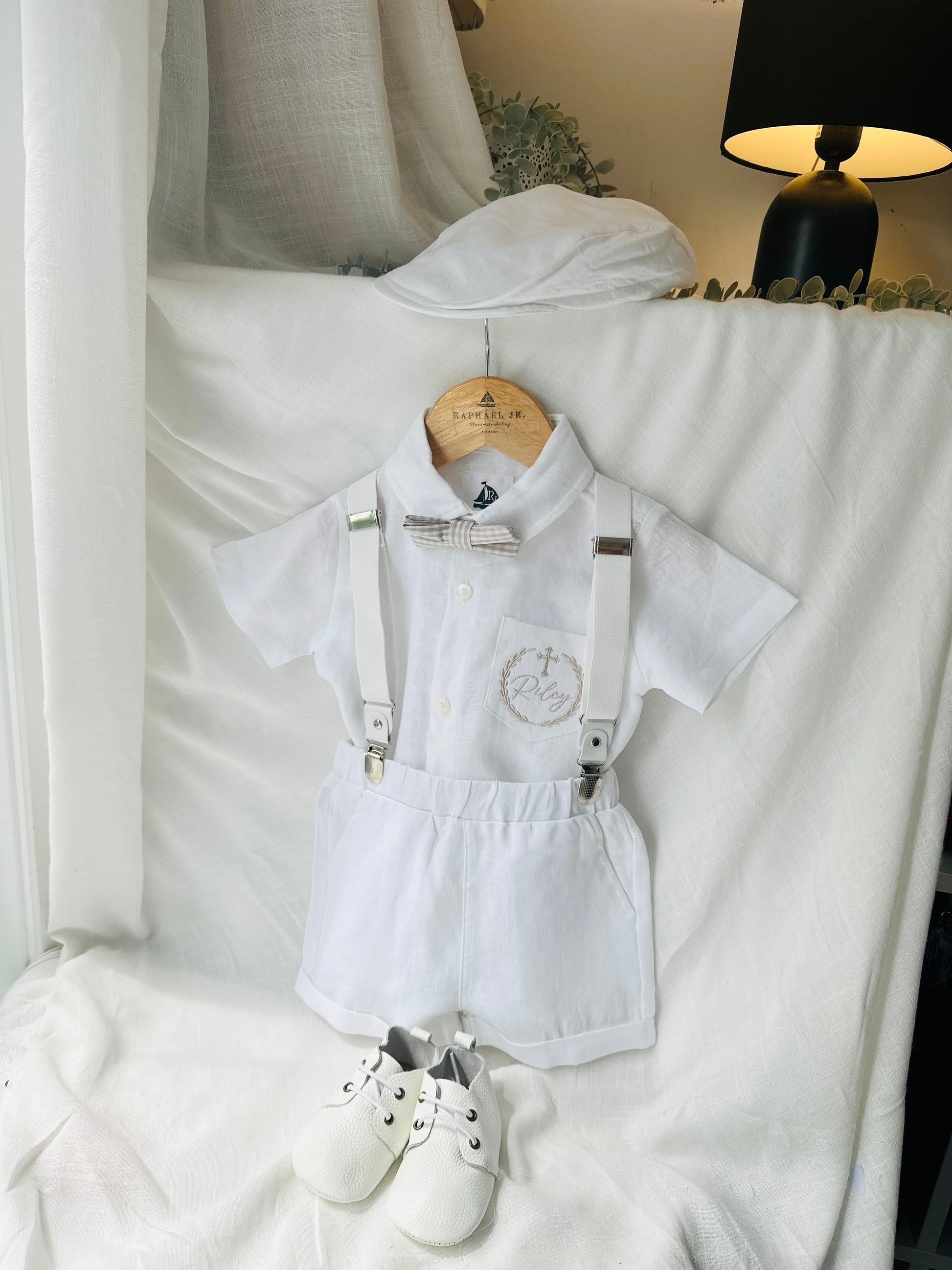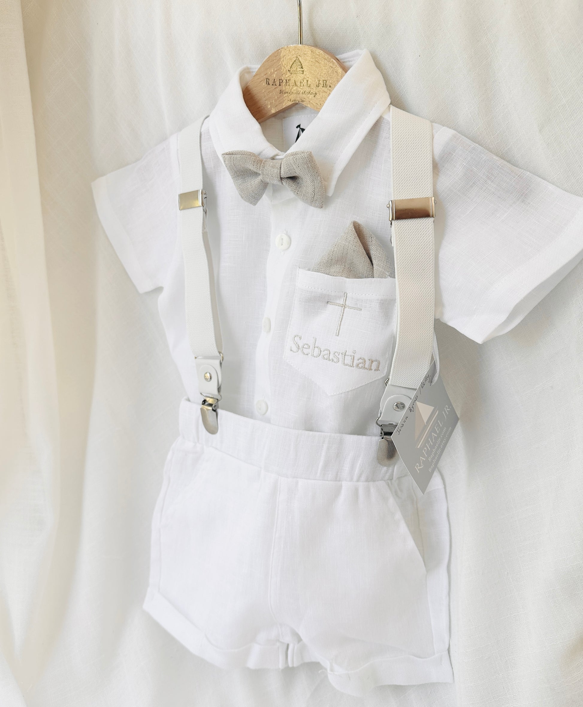 White linen summer Baptism outfit with suspender shorts, shirt, bowtie plus optional extras