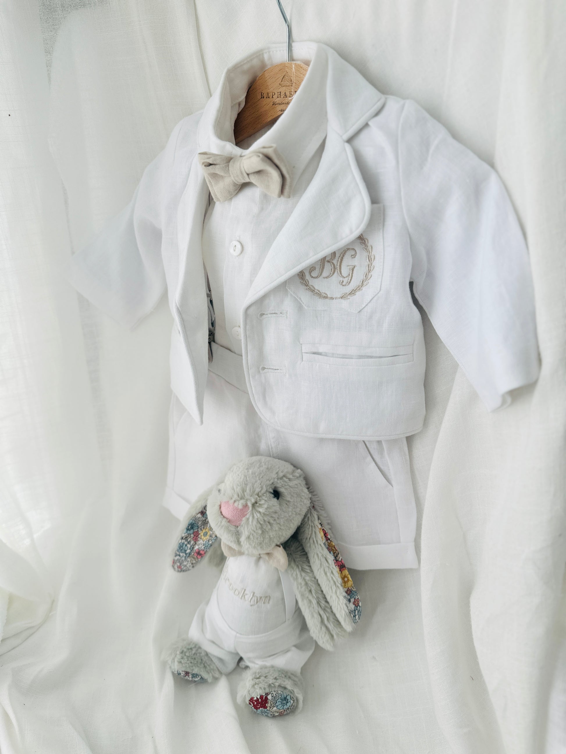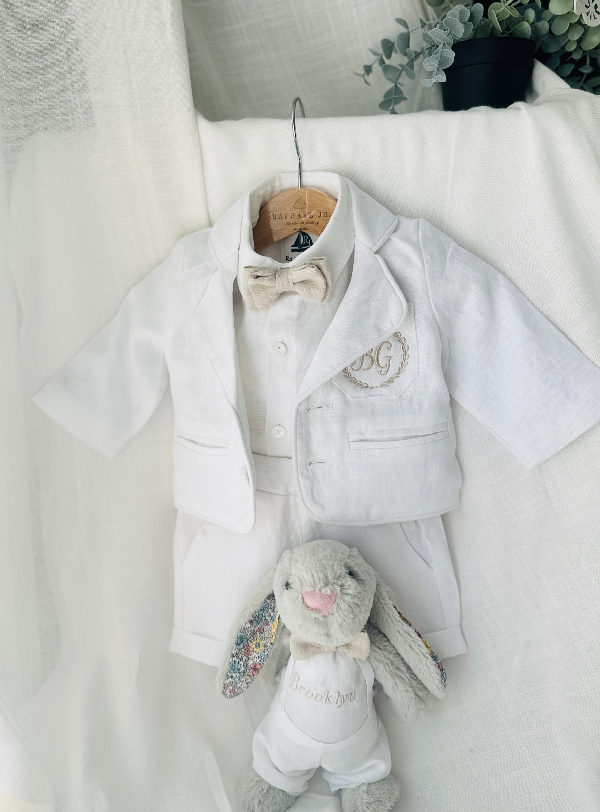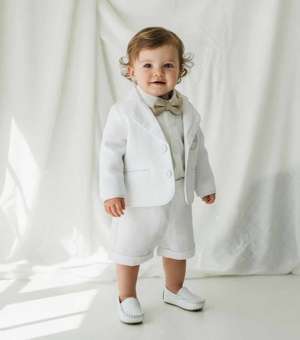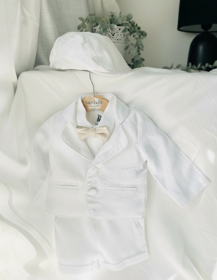 White linen summer Baptism outfit with suspender shorts, shirt, bowtie plus optional extras