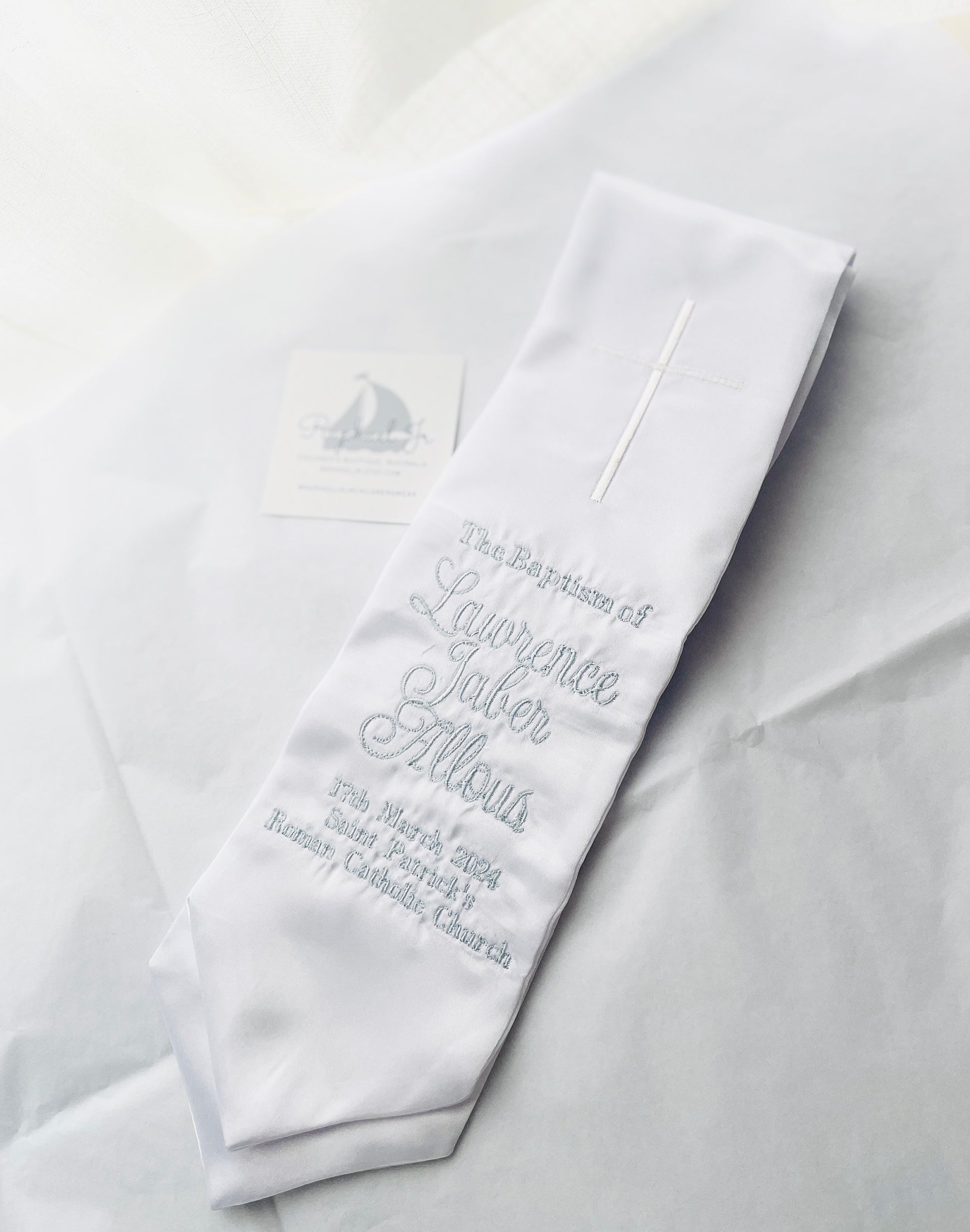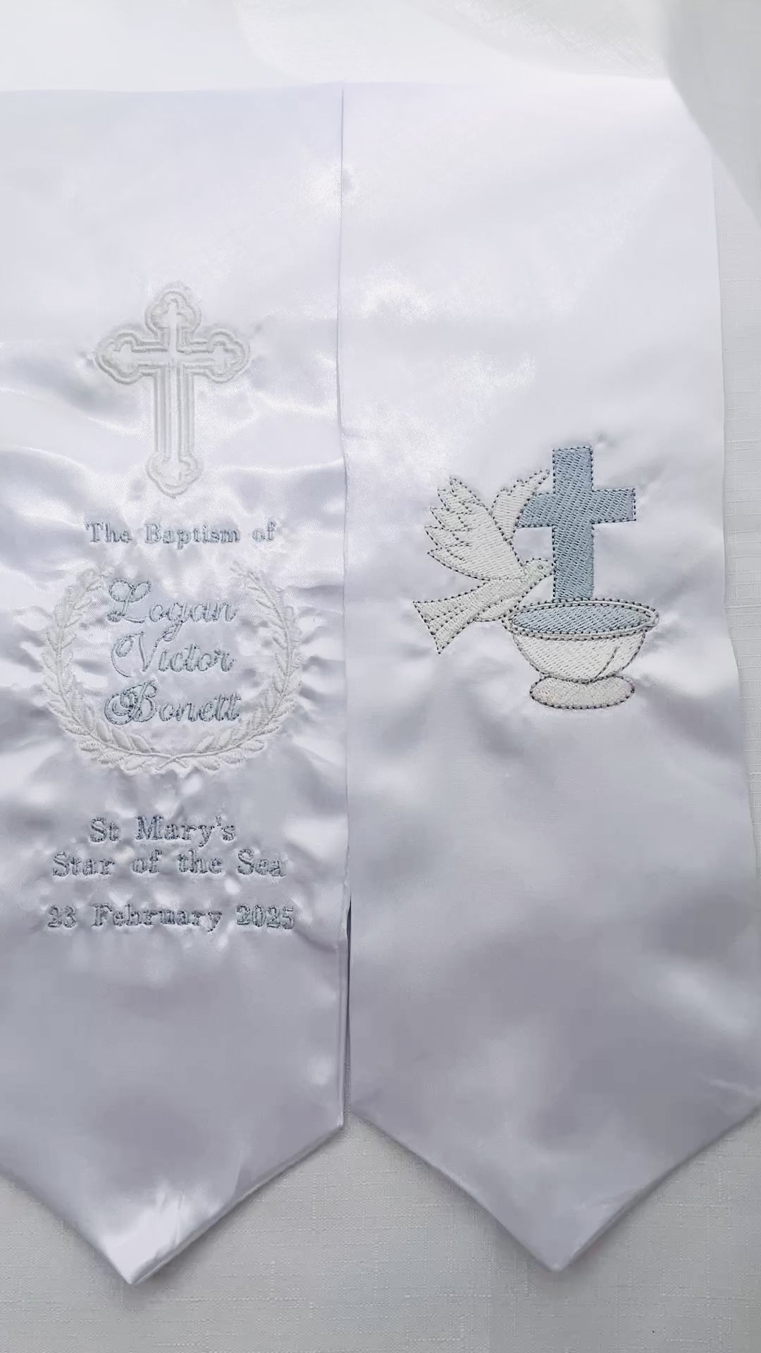 Embroidered custom made christening/baptism stole/sash with personalised embroidery of your choice. Either one side or both sides embroidered.